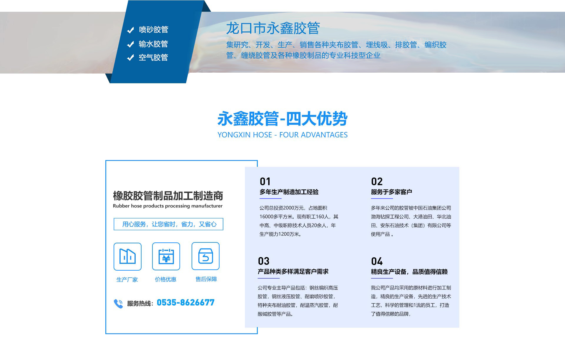 龍口市永鑫膠管有限公司始建于1979年。位于山東半島北端——龍口市,毗鄰龍口港、威烏高速公路和大萊龍鐵路,商業(yè)運輸,交通方便,地理位置好。公司總投資2000萬元,占地面積16000多平方米。現(xiàn)有職工160人,其中高、中級職稱技術人員20余人,年生產(chǎn)能力1200萬米。多年來公司的膠管被中國石油集團公司渤海鉆探工程公司、大港油田、華北油田、安東石油技術(集團)有限公司等使用產(chǎn)品我公司迎著十八界三中全會的改革大潮始終闊步向前,目前我公司主要從事高低壓橡膠軟管、鉆探膠管、夾布膠管、噴砂膠管、橡膠管帶制品,等產(chǎn)品的生產(chǎn)和研發(fā),主導產(chǎn)品包括:生產(chǎn),研制高低壓橡膠軟管、輸送皮帶等以橡塑為主的產(chǎn)品,擁有各類進口,國產(chǎn)生產(chǎn)設備120多臺套,化驗,分析,試驗儀器設備種類多,檢測手段完善。我公司產(chǎn)品均采用的原材料進行加工制造,精良的生產(chǎn)設備和穩(wěn)定技術工藝,科學的管理,打造了客戶信任的牌子,先后與多家石油、化工、汽車制造等大型國有企...